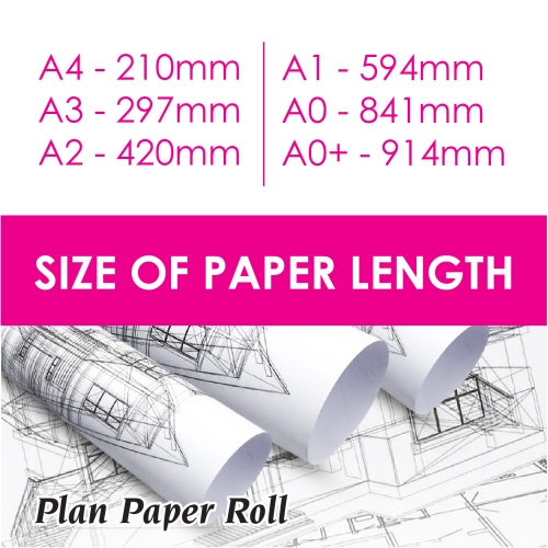 Size Available: A2 Size - 420mm x 50m x 2 inch Core A2 Size - 420mm x 150m x 3 inch Core A2 Size - 594mm x 50m x 2 inch Core A2 Size - 594mm x 150m x 3 inch Core A2 Size - 841mm x 50m x 2 inch Core A2 Size - 841mm x 150m x 3 inch Core