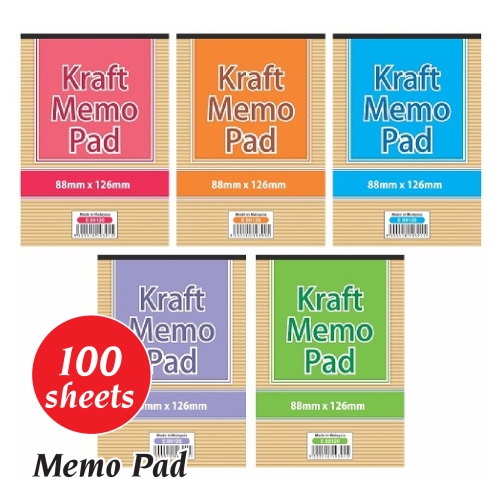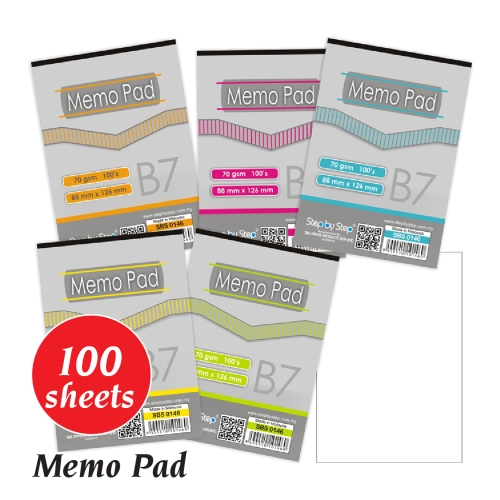 Quality : 70 gsmDescription : 100's White Memo Pad (Non-NCR)Type: Open TopQuantity In Carton : 12cps x 24pktRemarks: Cover Design random post out, TQ